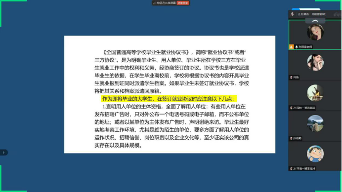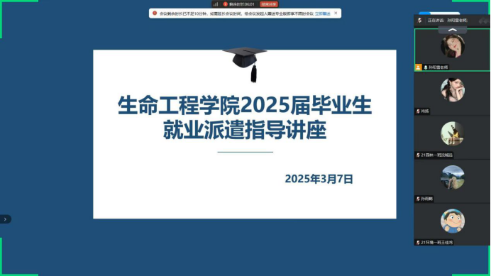 为精准落实毕业生就业工作,帮助2025届毕业生清晰了解就业派遣流程,提升求职签约能力,2025年3月7日,生命工程学院毕业生辅导员孙阳雪老师通过腾讯会议召开了“2025届毕业生就业派遣指导专题讲座”。