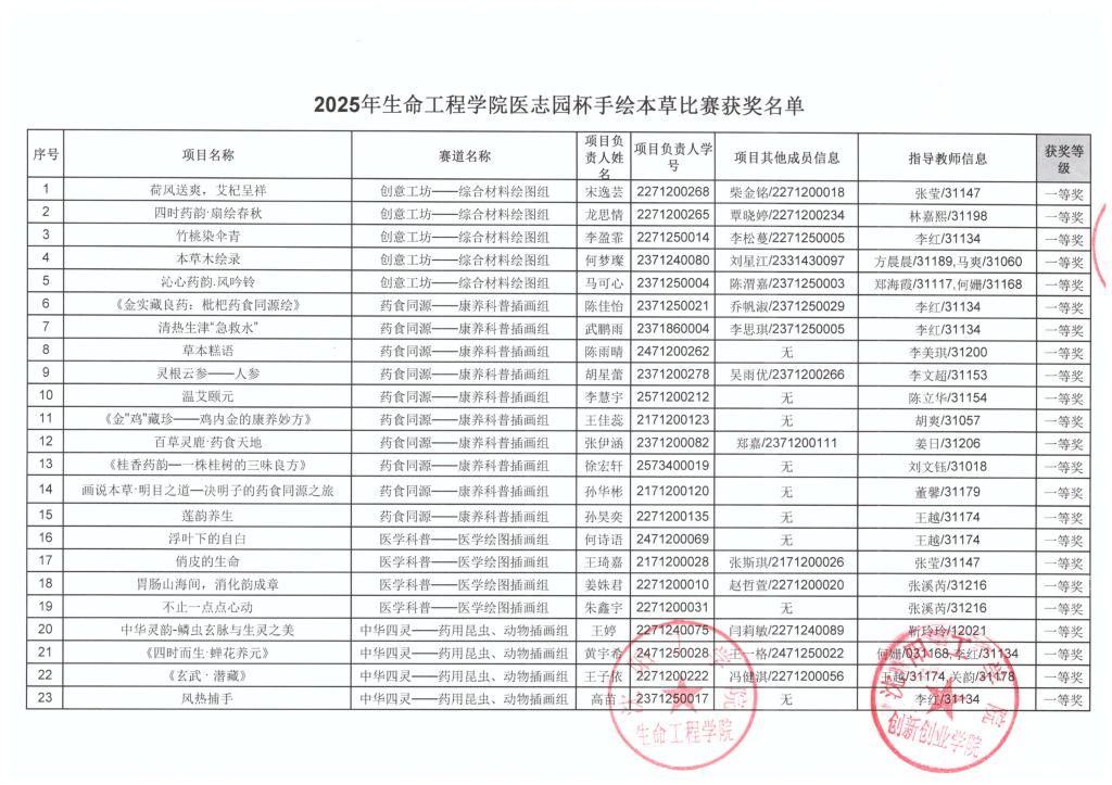 【大赛获奖】2025年生命工程学院医志园杯手绘本草比赛获奖名单