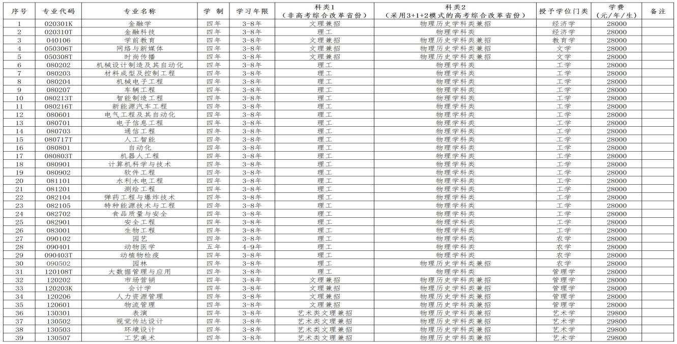 2025年我校部分专业继续实行按学科门类招生。大类招生的专业有:电子信息类(电子信息工程、通信工程)、计算机类(计算机科学与技术、软件工程)、兵器类(弹药工程与爆炸技术、特种能源技术与工程)、设计学类(视觉传达设计、环境设计、工艺美术)。